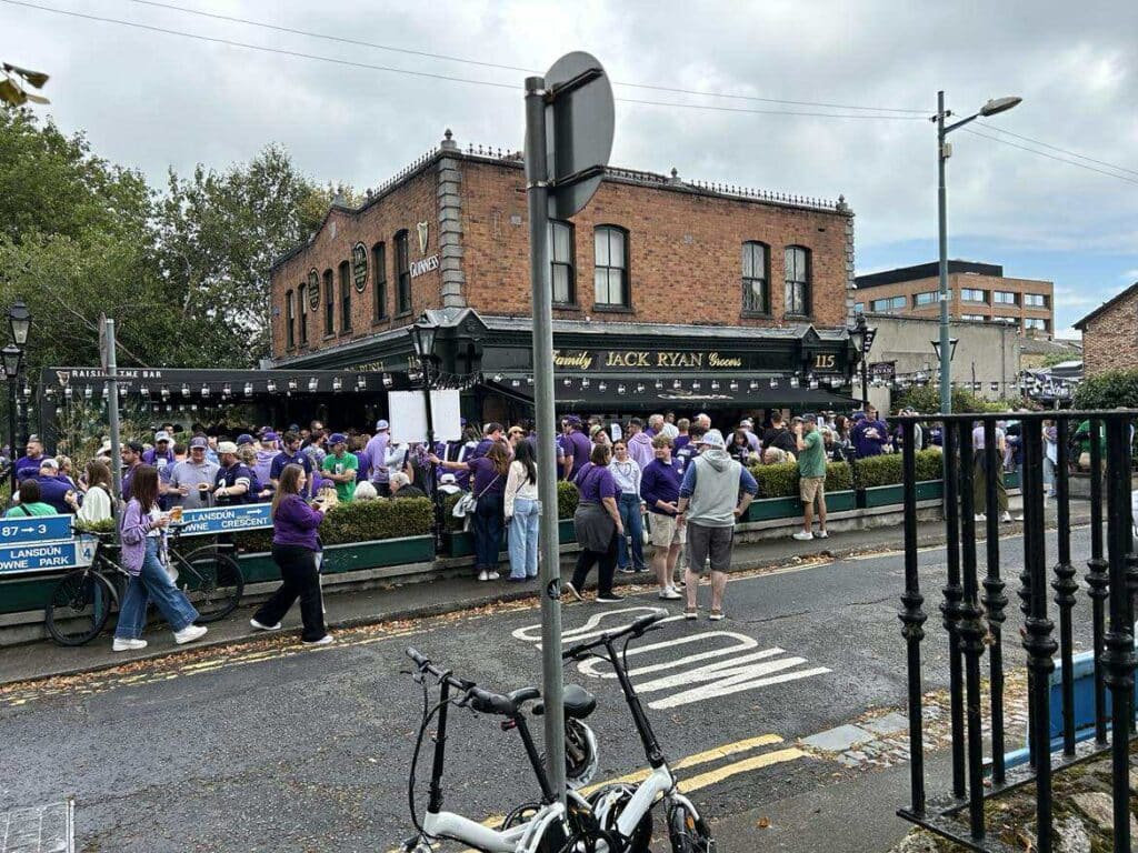 Vi fik mulighed for at tale med et par fans på Jack Ryan, en bar tæt ved Aviva Stadium. Baren var fuldstændig overtaget af Kansas State-fans, og i deres lilla trøjer var de umulige at overse. Mange fortalte, at de boede tæt på – eller i hvert fald hvad amerikanerne mener er tæt på – universitetet. Flere var tidligere studerende på Kansas State, og det stod klart, at skolen betyder langt mere end blot et fodboldhold. For mange er det en identitet. Netop denne kamp og den stærke skolestolthed havde fået dem til at gribe chancen for at opleve verden uden for USA, noget de fleste ikke havde prøvet før.