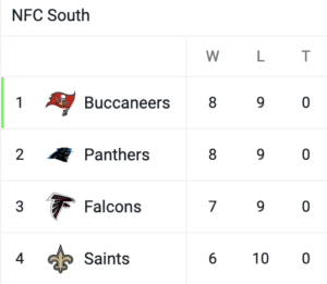 Med en Falcons-sejr slutter Panthers, Buccaneers og Falcons alle med 8-9, og så er det Panthers, der har den interne tiebreaker, fordi de har slået Falcons to gange og vundet tre af fire interne opgør mod Falcons og Buccaneers.